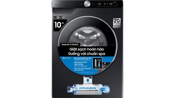 Điểm nổi bật đầu tiên ở chiếc máy giặt Samsung Bespoke này là công nghệ AI Ecobubble™. Công nghệ bong bóng siêu mịn này giúp hòa tan bột giặt nhanh chóng, thẩm thấu sâu vào từng sợi vải mà không cần nước nóng.